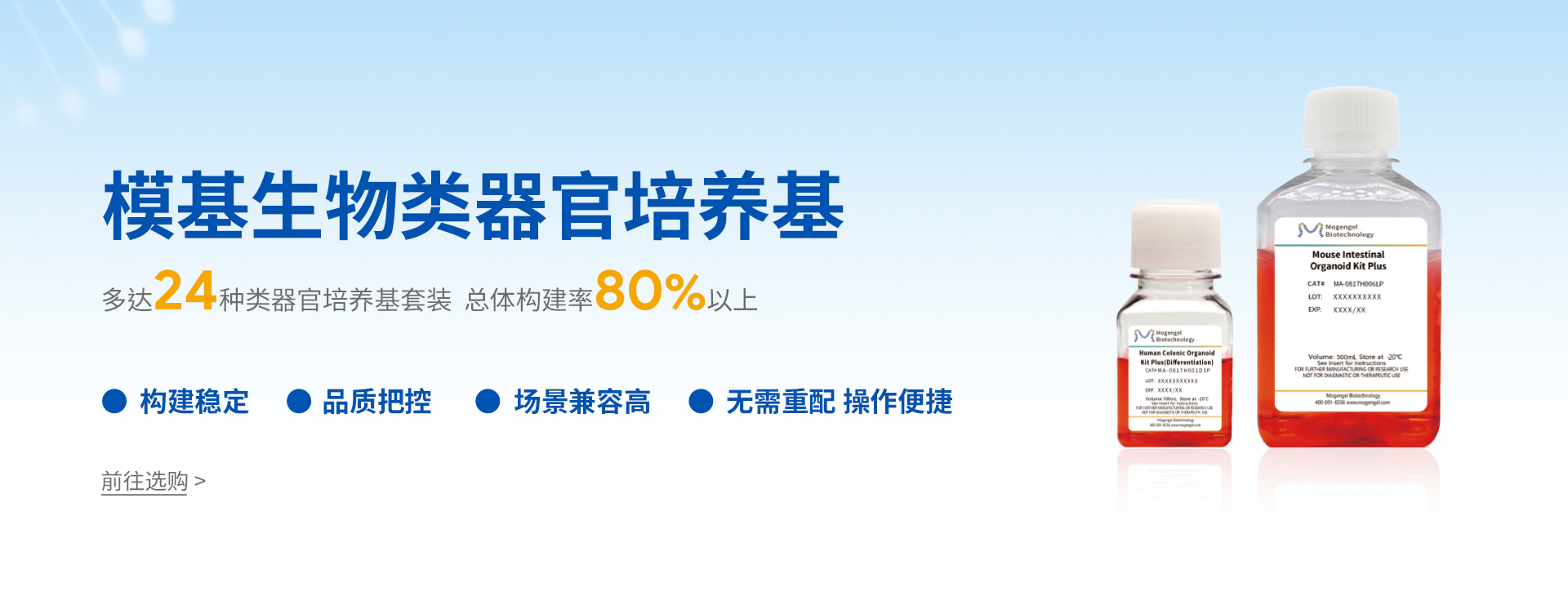 廈門模基生物科技有限公司致力于3D細胞培養核心原材料的研發(fā)與產業化升級,是國內一家從科研做起,從實驗研究中一路走來的全流程自主研發(fā)、自主生產的企業。目前公司的產品有基質膠、類器官培養基、細胞因子、3D細胞培養耗材、3D細胞培養智能顯微鏡等。公司擁有4大技術研發(fā)中心:分子克隆和細胞編輯中心、實驗動物中心、蛋白表達和純化平臺、類器官質檢系統和自動化。